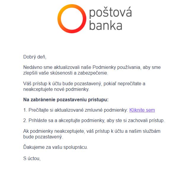 dovoľujeme si vás upozorniť na aktuálnu phishingovú kampaň, ktorá zneužíva vizuálnu identitu Poštovej banky s cieľom získavania citlivých osobných údajov s úmyslom ich zneužitia.
